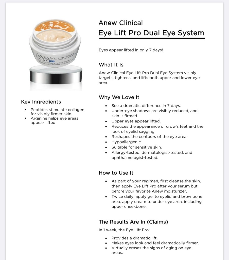 Anew Clinical Eye Lift Pro Dual Eye System is the only two-in-one system for a complete eye lift and for anyone wishing to help treat or prevent the telltale signs of aging. 0.66 total fl. oz.