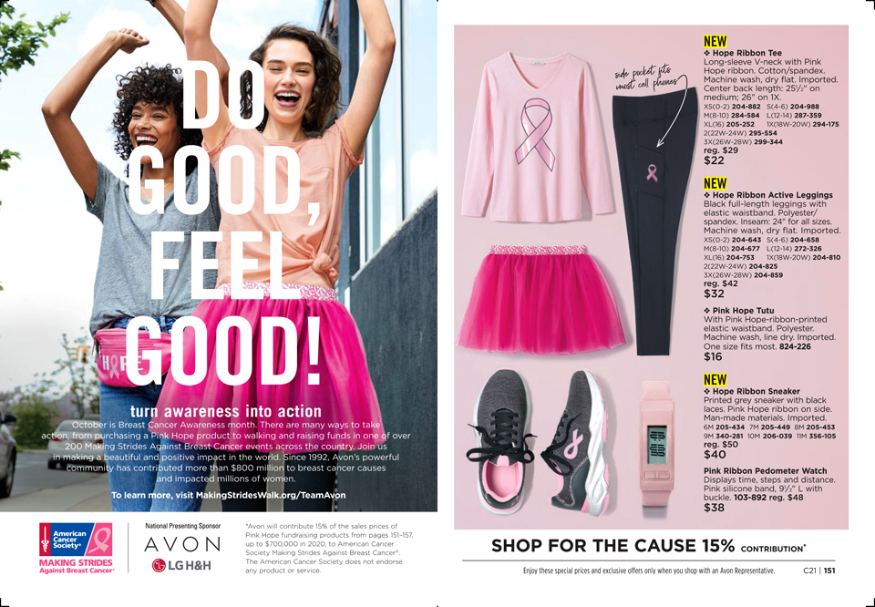 For decades, Avon has been fighting the most terrible enemy that attacks women: breast cancer. Avon has been working on education, prevention, treatment of breast cancer by selling products that can help in making Avon Foundation for Women. You can shop for the cause beginning on page 150-157