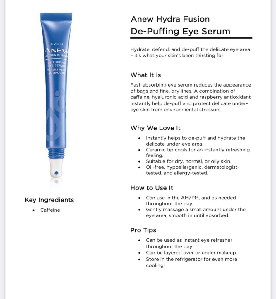 Anew Hydra Fusion De-Puffing Eye Serum is exclusively sold by Avon and can be purchased online from your Avon Representative.